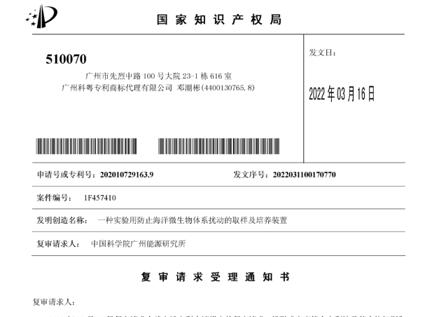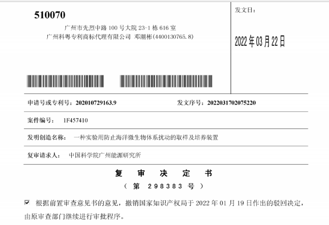 申请号为2020107291639,名称为《一种实验用防止海洋微生物体系扰动的取样及培养装置》发明专利申请驳回一案经科粤代理复审授权。