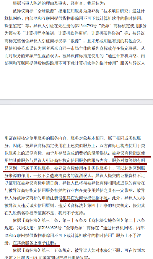 经过我司商标代理人的分析判断,在法定期限内提交了异议答辩材料,国家知识产权局经审理认为:被异议商标“全球数源”指定使用的“通过计算机网络、内部网和互联网提供货物跟踪用不可下载计算机软件的临时使用”服务与西湖电子引证商标“数源”核定使用服务的服务内容、服务对象基本相同,属于相同或类似服务,已构成使用于类似服务上的近似商标。而被异议商标“全球数源”指定使用的其他服务与西湖电子公司引证商标“数源”核定使用服务的服务内容、服务对象等均有明 显区别,不属于类似服务,被异议商标使用在非类似服务上,可以起到区别服务来源的作用,一般不会造成消费者的混淆误认。