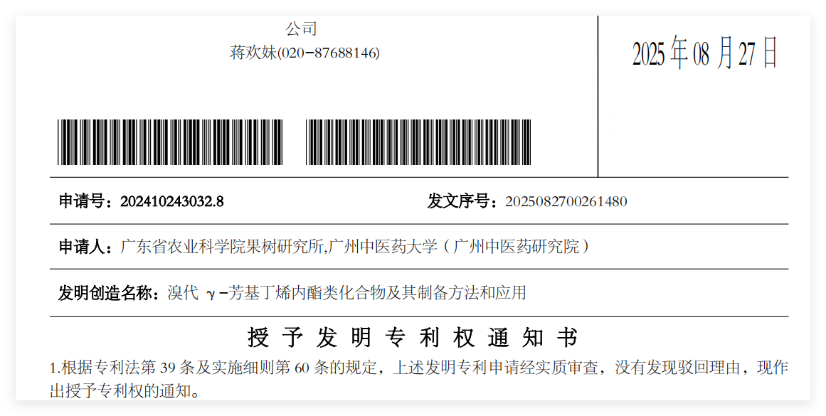 2025年8月27日,广东省农业科学院果树研究所、广州中医药大学(广州中医药研究院)的专利号为2024102430328,发明名称为《溴代γ-芳基丁烯内酯类化合物及其制备方法和应用》没经答复审查意见通知书直接拿到授权通知书。