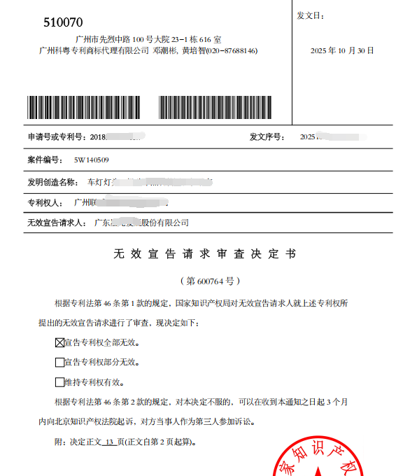 二连胜!科粤再次为某知名LED汽车大灯上市公司成功无效其竞争对手专利