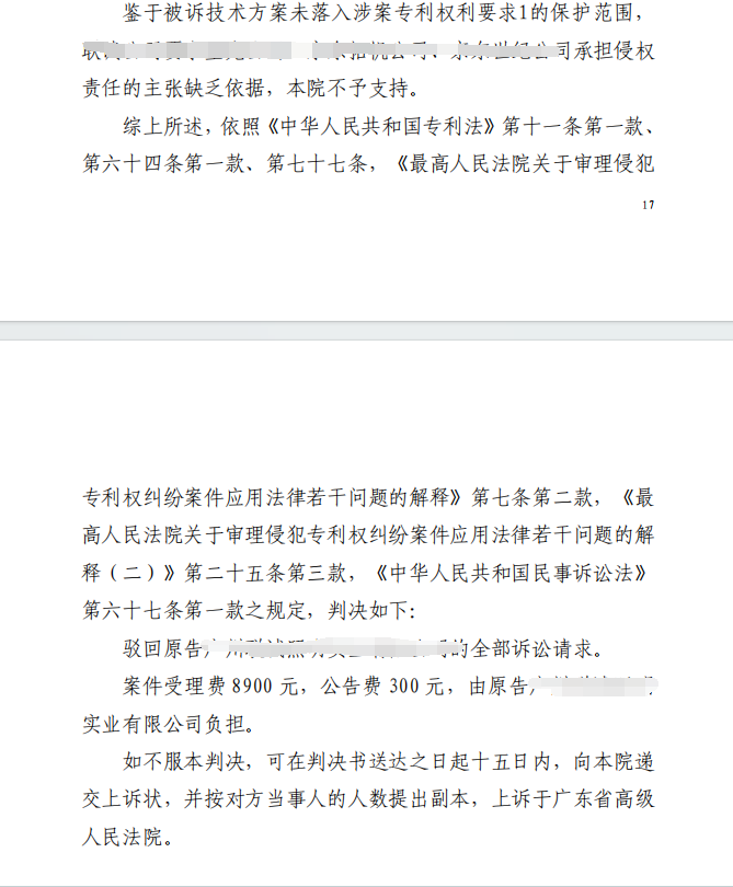 在侵权诉讼阶段,科粤公司专利代理师围绕被诉产品是否落入专利权利要求保护范围这一核心争议,深入剖析技术特征,精准指出被诉技术方案缺乏涉案专利权利要求1中“控制电路板设置在导热管套内”“两个灯板”及“两个灯板分别装设在导热安装板两个侧表面”等关键技术特征,成功说服法院认定不构成侵权。法院最终驳回原告全部诉讼请求,为客户免除高额赔偿及商誉风险。