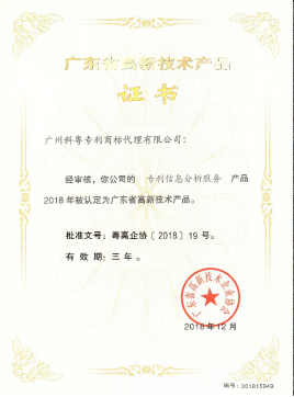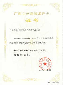 热烈祝贺广州科粤专利商标代理有限公司(以下简称“我司”)的知识产权信息推送服务与专利信息分析服务,被认定为广东省高新技术产品。