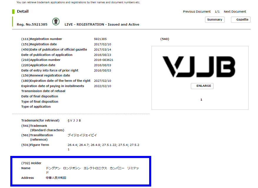 图片:日本专利局数据库信息已更新该商标的持有人是东莞市龙拓鑫电子有限公司