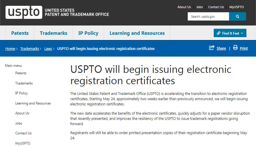 美国专利商标局把停发纸质证书,仅颁发电子注册证的时间提前到5月24日,比之前宣布的时间提前了两周左右。